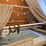 Addormentarsi e svegliarsi in un letto del genere sarà un vero piacere e il vostro bambino accoglierà ogni giorno con un sorriso. Non ci vuole molto per creare una camera deliziosa in stile romantico: guardate voi stessi. Le tende sono preparate per una specifica dimensione del letto. Scegliendo una determinata dimensione del letto, riceverete le tende che vi si adatteranno perfettamente. La tenda non coprirà i piedi del letto. Ad esempio, se si sceglie di avere i piedi allungati di 20 cm, lo spazio tra il pavimento e la struttura del letto rimarrà scoperto.
